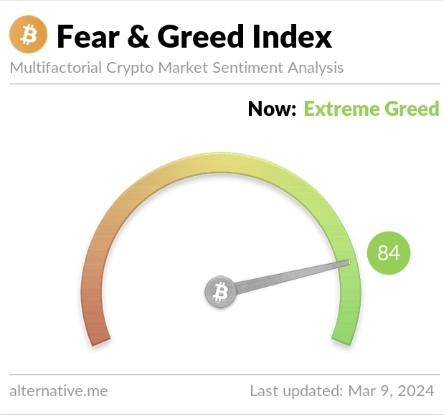 8일(현지시간) 가상자산 데이터 제공 업체 얼터너티브(Alternative)의 데이터에 따르면 공포·탐욕 지수는 전일 대비 3포인트 상승한 84포인트를 기록했다. 간 밤 비트코인(BTC)이 사상 최고가를 기록하는 등 가상자산 시장의 투심이 강화된 것으로 분석된다.
