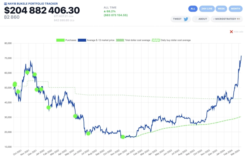 12일 가상자산(암호화폐) 전문 매체 코인데스크는 '비트코인 트레저리스'의 데이터를 인용해 비트코인이 지난해부터 약 250% 급등한 현재 엘살바도르가 보유한 비트코인은 2681개(약 2억600만달러)에 달한다고 보도했다. 엘살바도르의 평균 매입 단가는 4만2600달러로 알려졌으며, 이에 따른 수익률은 약 69%로 집계됐다.