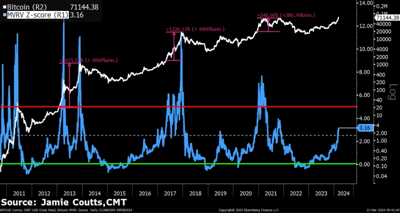 12일(현지시각) 제이미 쿠츠(Jamie Coutts) 블룸버그 분석가는 X를 통해 "비트코인의 MVRV Z-점수는 3보다 크다"라며 "앞으로 이 수치가 5\~6까지 상승할 것"이라고 전했다. 이어서 "이는 패시브 비트코인 현물 ETF 매수자와 ESG 펀드 매니저 등이 가상자산 시장에 들어왔기 때문"이라며 앞으로 새로운 시대가 찾아올 것이라고 설명했다.
