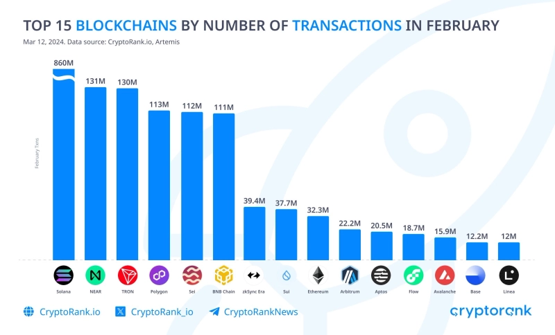 가상자산(암호화폐) 분석 플랫폼인 크립토랭크(CryptoRank)는 X를 통해 2월 거래 건수 상위 15개 블록체인을 발표했다. 자료에 따르면 솔라나(SOL)는 8억6000만 건의 거래를 기록해 1위를 차지했고, 니어 프로토콜(NEAR)와 트론(TRX)가 각각 1억3100만, 1억3000만 건의 거래가 이뤄져 2, 3위에 위치했다.