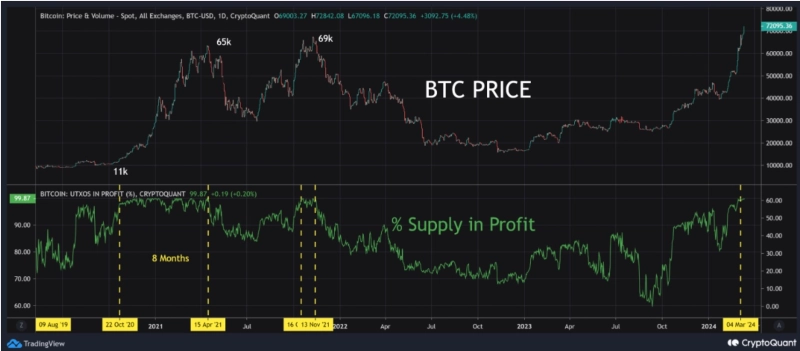 분석가는 "비트코인을 보유한 지갑 주소 99%는 수익를 나타내고 있다"면서 "(조정을 포함한) 강세장은 몇 달 동안 지속될 수 있다. (비트코인의 강세는) 이제 막 시작하는 단계"라고 덧붙였다.