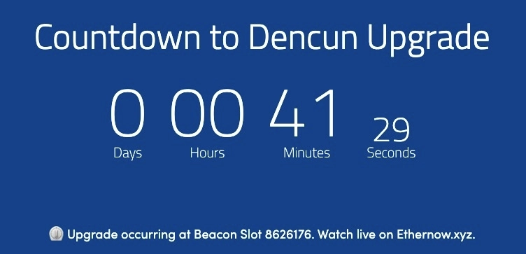 이더리움(Ethereum, ETH)의 대규모 업데이트 '덴쿤(Dencun)'이 한 시간 앞으로 다가온 것으로 전해진다.