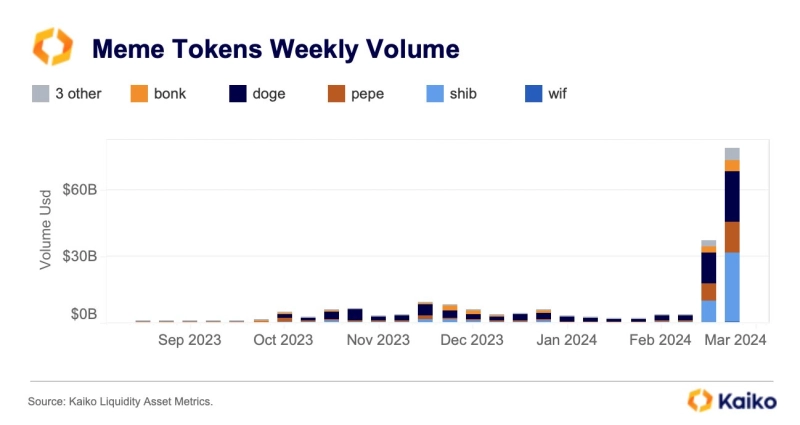 13일(현지시각) 가상자산 리서치 기업인 카이코(Kaiko)는 X를 통해 "최근 7일 동안 밈코인의 거래 규모가 800억 달러를 기록했다"라고 전했다. 이는 2021년 10월 이후 가장 많은 규모다.