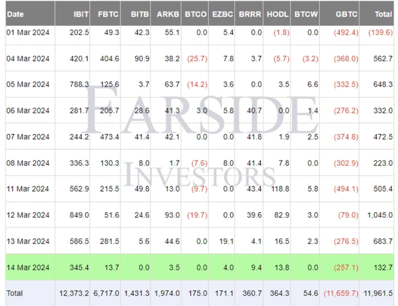 15일 파사이드 인베스터 ETF 데이터에 따르면 지난 14일 비트코인 현물 ETF로 1억3270만달러가 순유입됐다. 지난 1월 11일부터 현재까지 비트코인 현물 ETF에 발생한 누적 순유입은 119억6150만달러로 집계됐다.