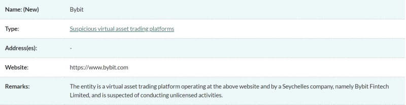 홍콩 금융규제기관 증권선물위원회(SFC)가 글로벌 가상자산(암호화폐) 거래소 바이비트(Bybit)를 '의심(suspicious)'단계로 분류했다.
