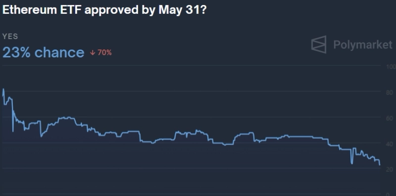 15일(현지시간) 가상자산 전문 매체 더블록은 탈중앙화 예측 플랫폼 폴리마켓에서 '5월 말까지 이더리움 현물 ETF가 승인 될까요?'라는 질문에 오직 28%의 참여자만이 '그렇다'라고 답했다고 보도했다. 이는 지난 1월 10일 폴리마켓에서 해당 설문이 기록한 승인 예상(74%)에 비해 크게 하락한 수치다. 16일 오전 6시 47분 현재는 보다 내린 23%를 기록 중이다.