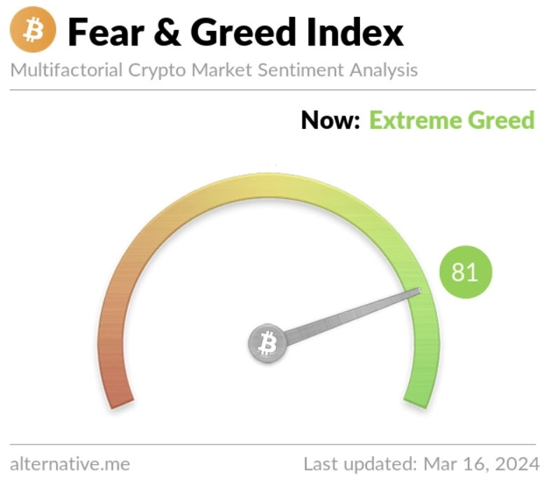 16일 가상자산 데이터 제공 업체 얼터너티브(Alternative)의 데이터에 따르면 공포·탐욕 지수는 전일 대비 2포인트 하락한 81포인트를 기록했다. 다만 '극단적 탐욕'단계는 여전히 유지했다. 연일 비트코인(BTC) 등 시가총액 상위 가상자산들이 하락세를 기록하며 투심이 소폭 약화된 것으로 분석된다.