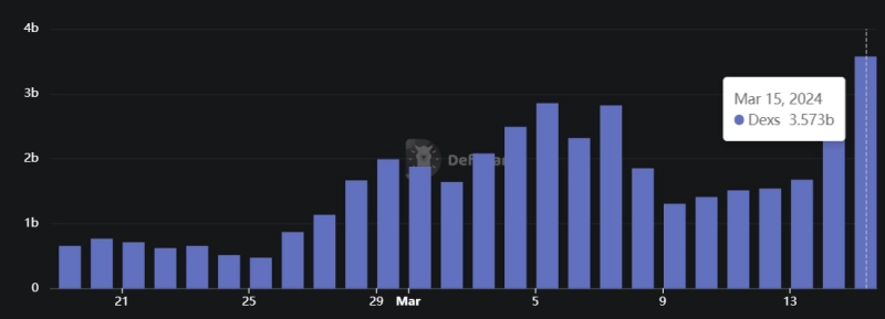 16일 오후 1시 34분 현재 디파이라마 데이터에 따르면 지난 24시간 솔라나 DEX의 거래량은 전일대비 52% 급등한 35억7300만달러로 집계됐다. 이는 이전 기록을 약 7억달러 가량 앞지른 역대 최고기록이다. 솔라나 DEX는 앞서 지난 5일(현지시간) 거래량 28억5300만달러를 기록하며, 최고치를 경신한 바 있다.