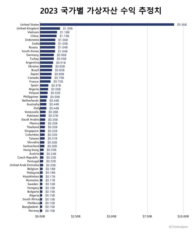블록체인 데이터 분석기업 체이널리시스는 ‘2023년 국가별 가상자산 수익 추정치’를 공개했는데, 한국인 투자자는 지난해 10억4000만달러(1조3693억원)의 수익을 냈다고 15일 밝혔다.