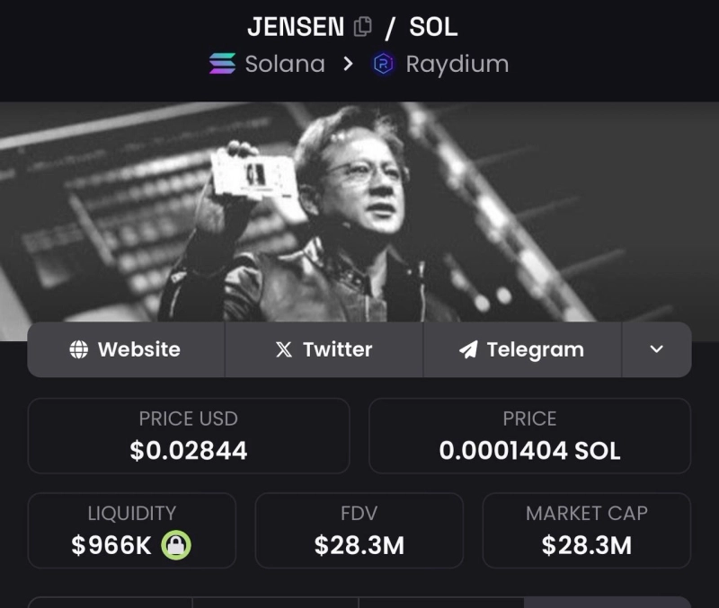 솔라나 기반 밈 코인 젠슨(JENSEN)은 엔비디아의 CEO인 젠슨 황의 실물과 유명한 개구리 밈 페페를 혼합한 모습으로 만들어졌으나 주로 공식 채널과 커뮤니티에서 젠슨의 실물 사진을 그대로 쓴다. 가상의 캐릭터가 아닌 실질적인 업적과 영향력을 가진 인물과 연결시켜 커뮤니티의 참여를 유도하고, 젠슨의 행보를 함께 팔로우한다는 전략이다. 16일 공식 X를 통해 엔비디아 개발자 프로그램에 합류했다는 소식도 전했다. 18일 덱스스크리너에 따르면 JENSEN/SOL은 지난 24시간 동안 -6.26% 하락했다.