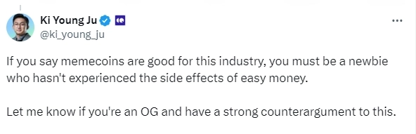 주기영 크립토퀀트 대표가 18일(현지시간) X(구 트위터)를 통해 "밈코인은 가상자산(암호화폐) 산업에 해를 끼친다"라며 "시가총액 수십억 달러 규모의 밈 코인이 업계 발전을 위해 합법적인 제품을 개발하는 팀의 노력을 가리는 것 같다. 이는 실망스러운 일"이라고 전했다.