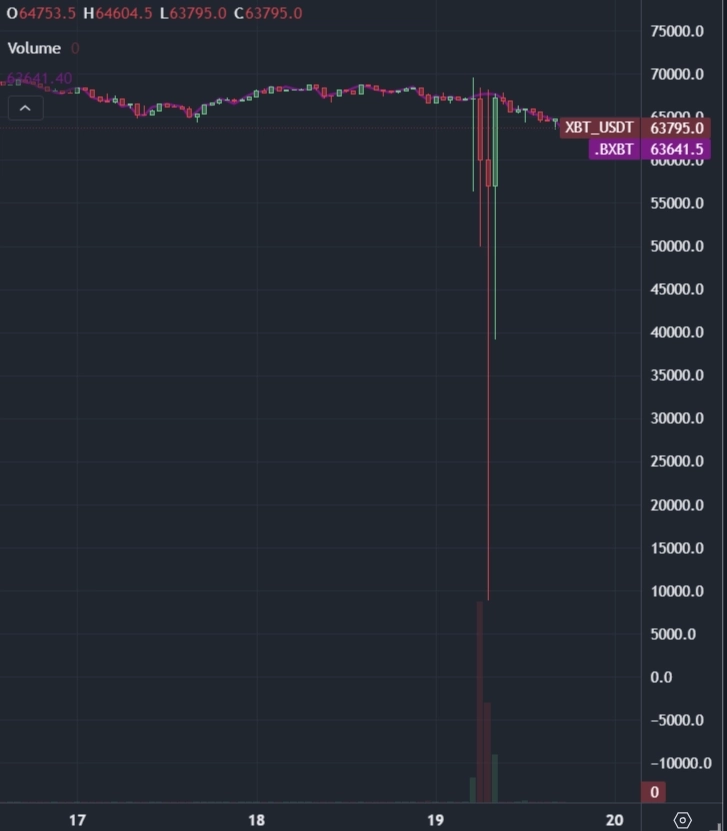 비트코인(BTC)이 비트멕스 거래소에서 일시적으로 8900달러까지 급락하는 비정상적인 사건이 발생했다. 같은 시간 국내, 해외 다른 거래소의 비트코인 가격은 6만 달러 이상을 유지 중이었다.