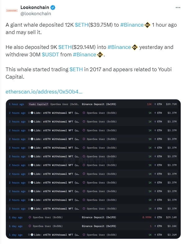 20일(현지시간) 룩온체인이 X(구 트위터)를 통해 "1시간 전 특정 고래 주소가 1만2000이더리움(ETH)을 바이낸스로 입금했다"라며 "이는 3975만달러 규모로, 매도할 가능성이 있다"고 전했다.