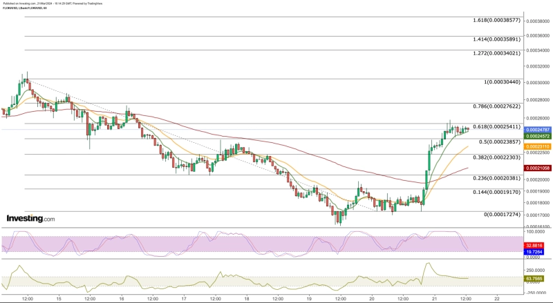 플로키는 45% 되돌림에도 불구하고 0.00017달러에서 0.00024달러로 40% 급등했으며, 0.000250달러 이상으로 마감하면 0.00035\~0.0004달러까지 상승할 가능성이 있다.