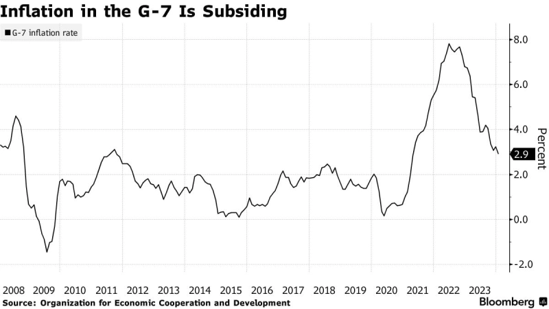 선진국의 인플레이션도 점차 둔화하는 모양새다. 경제협력개발기구(OECD)에 따르면 주요 7개국(G7)의 지난 1월 인플레이션율은 연 2.9%를 기록했다. 2021년 4월 이후 최저치다. 각국 중앙은행의 목표치(2%)에도 근접하고 있다.