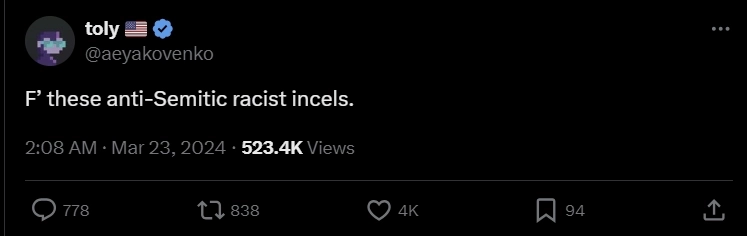 22일(현지시간) 가상자산 전문 매체 크립토슬레이트는 솔라나 설립자 아나톨리 야코벤코가 자신의 X(트위터) 계정에 "반 유대주의의 인종차별적 독신주의자들아 X먹어"라는 트윗을 올렸다고 보도했다.