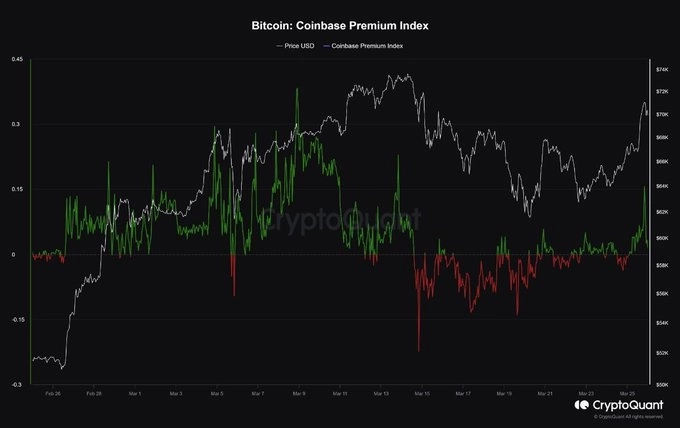 매즈 에버하트 크립토퀀트 분석가는 "코인베이스 프리미엄 지표가 양수로 돌아왔다는 것은 미국 소매 투자자와 기관들이 다시한번 매수세를 보이고 있음을 의미한다"라고 설명했다.