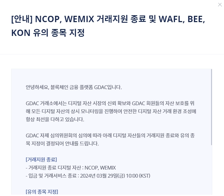 국내 가상자산(암호화폐) 거래소 지닥(GDAC)은 27일 공식 홈페이지를 통해 오는 29일 10시 위믹스(WEMIX)를 상장 폐지한다고 밝혔다.