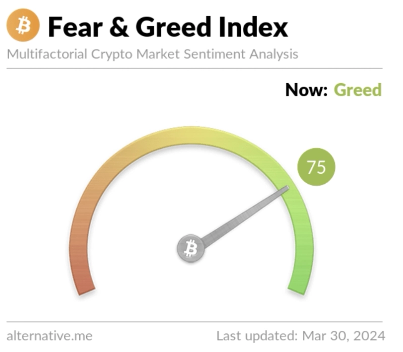 30일 가상자산 데이터 제공 업체 얼터너티브(Alternative)의 데이터에 따르면 공포·탐욕 지수는 전일 대비 4포인트 하락한 75포인트를 기록했다. 이날 시가총액 상위 가상자산들이 혼조세를 보이면서다.