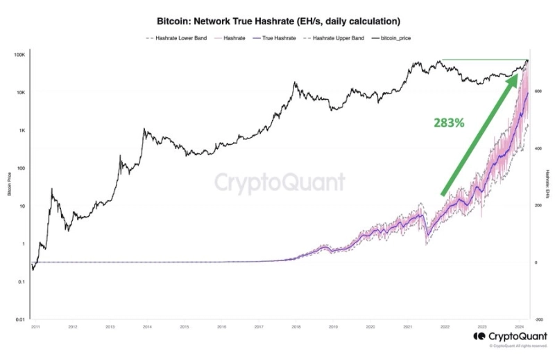실제 크립토퀀트 데이터에 따르면 해시레이트는 지난 2021년 강세장 대비 약 283% 급등한 것으로 조사됐다.