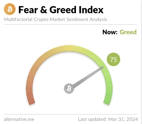 31일 가상자산 데이터 제공 업체 얼터너티브(Alternative)에 따르면 공포·탐욕 지수는 전일과 동일한 75포인트를 기록했다. 이날 시가총액 상위 가상자산들이 대부분 횡보하면서다.