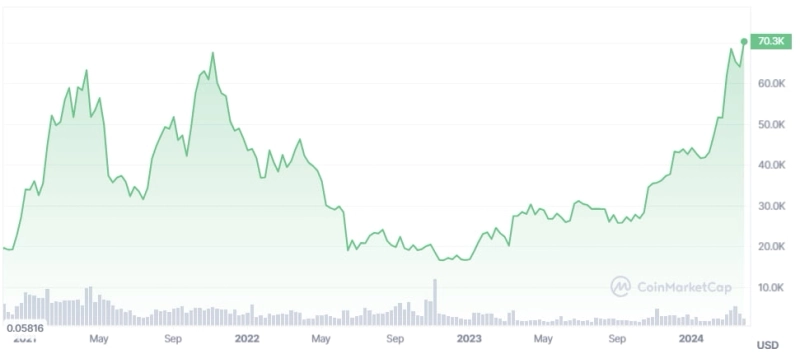 비트코인 가격은 1년 동안 150% 넘게 상승했다. 지난 3월14일엔 사상 최고가인 7만3000달러를 넘어서기도 했다. 하지만 이후 6만4000달러까지 떨어졌고, 아직 7만달러 선을 벗어나지 못하고 있다. 코인마켓캡에 따르면 비트코인은 한국시간 31일 오후 9시 기준 7만400달러에서 거래되고 있다.