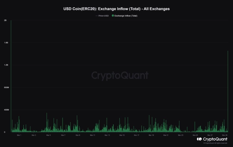 1일 온체인 분석 플랫폼 크립토퀀트(CryptoQuant)는 공식 X(트위터)를 통해 "지난 29일 코인베이스에 역사상 가장 큰 USDC 입금이 발생했다. 무려 14억달러 이상의 USDC가 유입됐으며, 이는 가상자산 매수 압력을 시사한다"라고 설명했다.