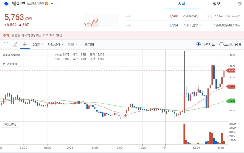 현재 웨이브는 업비트 원화마켓 기준 6.75% 상승한 5760원에 거래되고 있다.