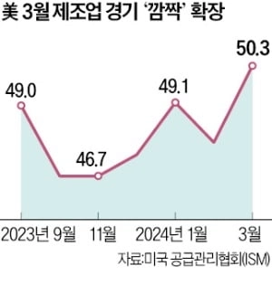 예상보다 견조한 미국 제조업 지표가 Fed의 금리 인하 기대감을 낮추면서 미국 국채 금리를 끌어올린 것으로 분석된다. 미국 공급관리협회(ISM)에 따르면 3월 제조업 구매관리자지수(PMI)는 50.3으로 집계됐다. 시장 전망치인 48.1을 웃도는 것은 물론 전월의 47.8보다 높았다.