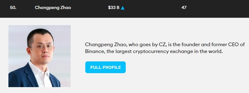 포브스 순위에 따르면 가상자산 업계에서 가장 높은 순위를 기록한 창펑 자오는 330억달러의 자산으로 전체 50위를 기록했으며, 브라이언 암스트롱 코인베이스 최고경영자(112억달러, 180위), 지안카를로 데바시니 비트파이넥스 최고재무책임자(92억달러, 266위), 파올로 아르도이노 테더 최고경영자(39억달러, 809위), JL 반더 벨드 비트파이넥스 최고경영자(39억달러, 809위), 크리스 라센 리플 공동창립자(32억달러, 1033위) 등 다수 유명인들이 순위에 이름을 올렸다.