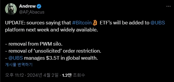 2일(현지시간) 앤드류 X3 캐피털 설립자는 자신의 X(트위터)를 통해 "업계 소식통에 따르면 다음주 UBS가 플랫폼 내 비트코인 ETF 거래를 지원할 계획"이라고 전했다.