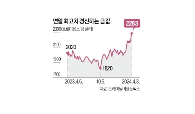 이스라엘과 이란 간 정면충돌 우려, 미·중 갈등, 11월 미국 대통령 선거 등으로 지정학적 불확실성이 커지자 안전자산으로서 금의 매력도 커지고 있다.