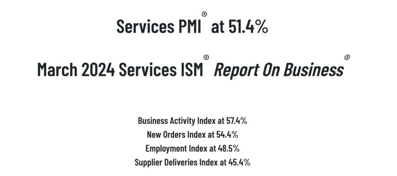 3일(현지시간) 미국 공급관리협회(ISM)이 발표한 자료에 따르면 3월 비제조업 구매관리자지수(PMI)는 51.4%로 전월 기록한 52.6%, 시장 예상치인 52.8%를 모두 하회했다.