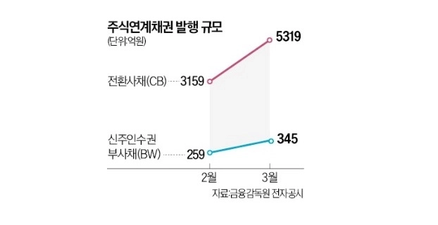 1일 금융감독원 전자공시에 따르면 3월 CB 발행 규모는 5319억9000만원이다. 전달(3159억4500만원) 발행액을 2000억원 이상 넘어섰다. BW 발행액도 2월 259억원에서 3월 현재 345억원으로 증가했다. 지난해 3월에는 BW 발행이 아예 없었다.