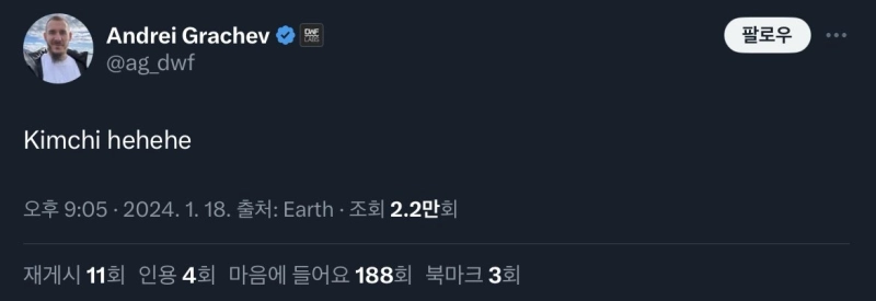 국내 가상자산 프로젝트 다수에 유동성을 공급하고 있는 DWF랩스 창립자 안드레이 그라체프도 X '김치 헤헤헤'라는 멘션을 남긴 후 상당한 질타를 받았다. DWF랩스는 국내 프로젝트와 투자 파트너십을 발표한 후 투자자들이 유동성을 공급을 통해 차익을 남겼다는 의혹을 받은 바 있다.