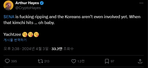논란은 지난 3일(현지시간) 비트멕스(BitMEX) 창립자 아서 헤이즈(Arthur Hayes)의 X(트위터) 멘션에서 시작됐다. 아서 헤이즈는 "에데나(ENA)가 폭등하고 있지만, 아직 한국인들은 매수세에 참여하지도 않았다. 만약 김치가 여기 온다면..."이라고 언급했다.