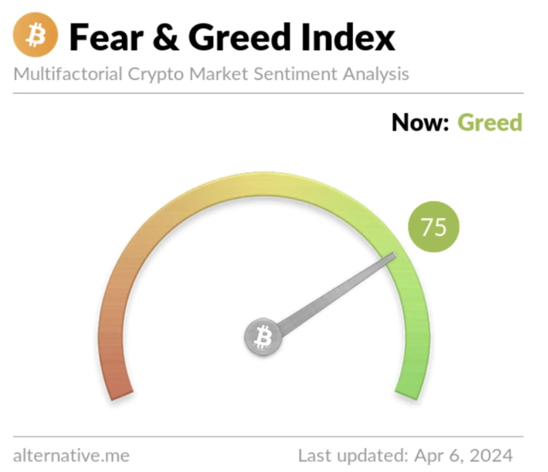 6일 가상자산 분석업체인 얼터너티브(Alternative)에 따르면 이날 공포·탐욕 지수는 전일 대비 4포인트 하락한 75를 기록했다.