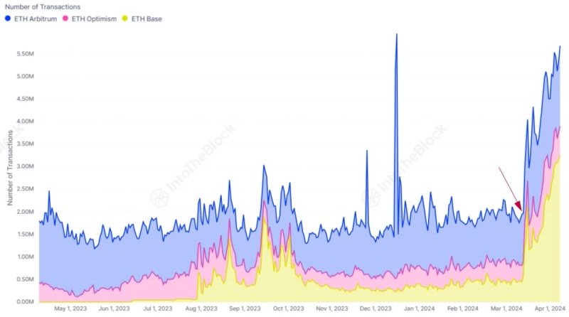 이더리움 덴쿤 업그레이드 이후에 레이어2의 트랜잭션 수가 급증한 것으로 나타났다.