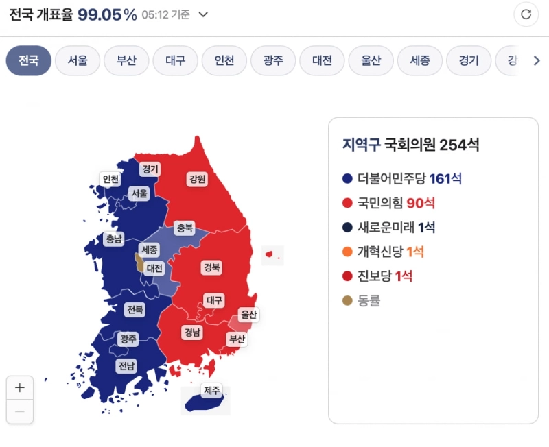 중앙선거관리위원회 제22대 국회의원선거 개표 현황에 따르면 11일 오전 5시 13분 전국 지역구 개표율 99.05% 기준 더불어민주당은 161곳, 국민의힘은 90곳, 진보당 1곳, 개혁신당 1곳, 새로운미래 1곳에서 앞서고 있는 것으로 나타났다.