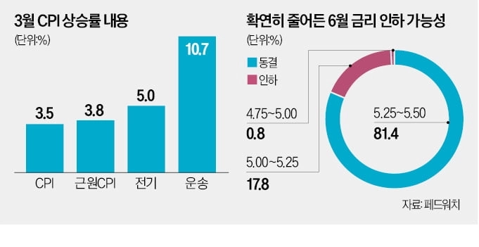 10일(현지시간) 미국 금리선물 시장은 뉴욕증시가 마감할 무렵 Fed가 6월 연방공개시장위원회(FOMC) 정례회의에서 현재 연 5.25\~5.50%인 기준금리를 동결할 확률을 81.4%로 반영했다. 하루 전만 해도 이 확률은 43%였다. 월스트리트저널(WSJ)은 “이번 CPI 보고서는 금리 인하 명분을 박탈했다”고 전했다.