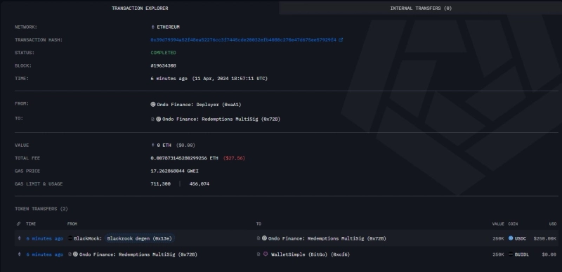 앞서 가상자산(암호화폐) 전문 매체 코인데스크는 이더스캔 데이터를 인용 한 온도 파이낸스의 지갑에서 약 25만달러 상당의 비들(BUIDL)토큰이 USDC로 교환됐다고 보도했다. 이에 대해 네이선 올먼 온도 파이낸스 최고경영자(CEO)는 "USDC에서 BUIDL토큰 스왑이 가능하다는 것을 확인하기 위한 시도였다"고 밝혔다. 아울러 그는 "이를 사용해 OUSG(온도파이낸스의 단기 미국 국채 토큰)를 USDC로 전환하는 데에도 사용할 것"이라고 덧붙였다.