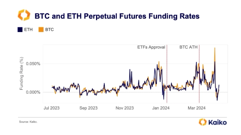 반면 반감기를 앞두고 상승을 베팅하는 레버리지 물량의 수요는 오히려 감소한 것으로 전해진다. 카이코에 따르면 최근 비트코인과 이더리움 선물 미결제약정(OI)은 달러화(USD)를 기준으로 사상 최고치를 기록했다. 반면 비트코인 선물 펀딩비(Funding Rate)는 지난주 마이너스 값을 기록하며 약세를 보였다. 카이코는 “비트코인 거래 활동이 증가했음에도 불구하고 펀딩비가 감소한 것은 강세를 전망하는 레버리지 물량의 수요가 줄어들었다는 걸 의미한다”라고 설명했다.