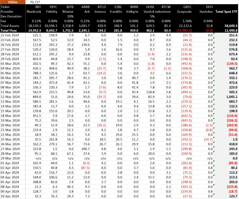 미국에 상장된 비트코인 현물 ETF는 자금 유입액이 최근 감소세를 나타내고 있다. 지난 12일 비트멕스 리서치에 따르면 블랙록 IBIT를 비롯한 미국의 비트코인 현물 ETF 10개는 지금까지 124억9000만달러가 순유입됐다. 그레이스케일의 ETF인 GBTC에선 자금 유출이 계속되고 있고 전체적인 자금 유입도 감소세를 나타내고 있다. 가상자산 전문 미디어 더블록은 "비트코인 현물 ETF 누적 거래량은 3월 초 정점을 찍은 후 전반적으로 꾸준히 감소하고 있다”라고 분석했다.