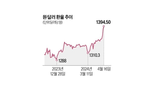 이날 환율 급등은 미 달러화 강세에 연동된 것이었다. 주요 6개국 통화 대비 달러 가치를 나타내는 달러화지수는 전날 5개월 만에 106대로 뛰었다. 15일 발표된 미국의 3월 소매판매 증가율이 0.75%로 시장 전망치(0.3%)를 두 배 이상 웃돌아 미국 경제가 강한 상태임이 다시 확인됐기 때문이다. 올해 미국 중앙은행(Fed)의 금리 인하 횟수 전망치가 연초 여섯 차례에서 현재 1\~2회 수준까지 낮아지면서 달러화가 더욱 강해지는 양상이다.
