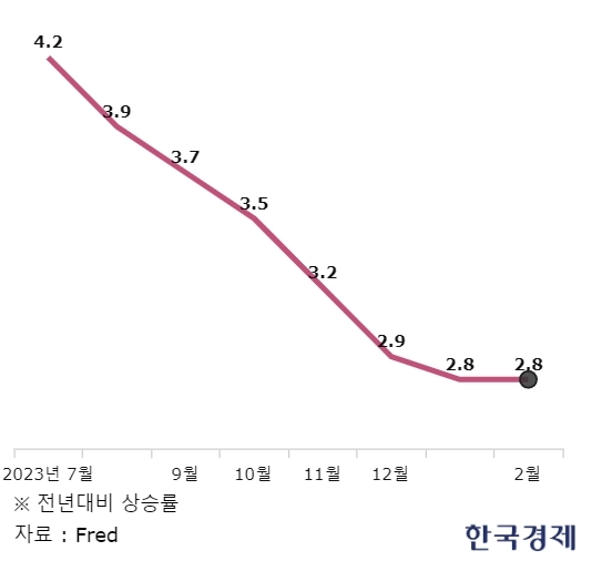Fed가 물가 측정에 주로 사용하는 근원 개인소비지출(PCE) 지수는 1\~2월 모두 전년 대비 2.8% 상승했다. 지난해 3월 5.3%에서 상승률이 큰 폭으로 떨어졌지만 여전히 Fed의 물가 목표치인 2%대보다는 높다.