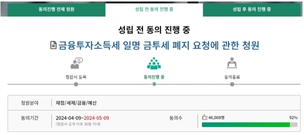 지난 수년간 청원의 단골 주제였던 '금투세' 청원이 또 다시 올라온 것은 이번 총선 결과 때문이다. 금투세는 정부 여당과 야당 간 이견이 큰 사안 중 하나이었다. 결과만 놓고 보면 예정대로 내년부터 금투세가 부과될 가능성이 높아져 국내 주식 투자자들로선 강하게 반발 중이다. 기존 큰 손들에게만 과세했던 것을 시세차익 연 5000만원을 넘는 모든 투자자들에게도 부과하겠다는 게 금투세의 골자이기 때문이다.