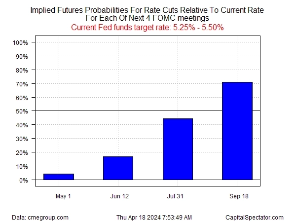 4월 18일 기준 CME 데이터에 기반한 연방금리선물은 9월 18일 FOMC에서 현재 5.25\~5.50% 목표금리를 인하할 확률을 71%로 보고 있다.