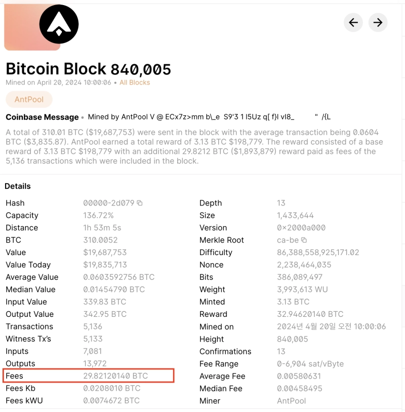 앞서 이날 오전 9시께 비트코인(BTC) 반감기가 도래한 뒤 채굴된 블록의 보상이 크게 늘어나고 있는 것으로 드러났다. 트랜잭션 수수료가 크게 늘어나면서 이같은 현상이 발생한 것으로 분석된다.
