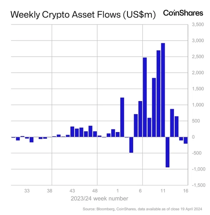 22일 가상자산(암호화폐) 투자회사는 코인셰어즈(CoinShares) 주간 보고서를 통해 "지난주 디지털 투자 상품에서 총 2억600만달러가 순유출됐다. 투자자들은 연내 금리 결정을 전망하며 초조해하고 있다"라고 밝혔다.