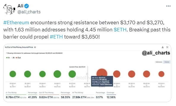 가상자산(암호화폐) 애널리스트 겸 트레이더 알리 마르티네즈(Ali Martinez)가 23일(현지시간) X(구 트위터)를 통해 "이더리움(ETH)이 3170달러\~3270달러 구간에서 강력한 저항에 직면해 있다"라며 "해당 구간에서 163만 개의 주소가 445만 ETH를 보유하고 있다"고 전했다.